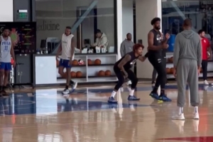 体育资讯10月15日讯 在今天的76人队内训练中,恩比德与队友轮流进行一对一的单挑。