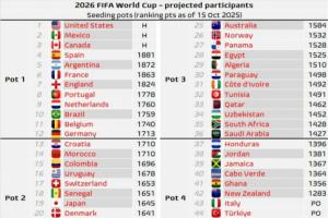 一档:美国*、墨西哥*、加拿大*、西班牙、阿根廷*、法国、英格兰*、葡萄牙、荷兰、巴西*、比利时、德国